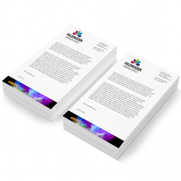 Veldhuizen Grafisch Effect biedt gedrukt briefpapier in alle maten, papiersoorten en afwerkingen. Zo kun je bij ons je briefpapier full colour laten drukken in offset topkwaliteit. Wij houden rekening met PMS-kleuren, ook als ze een bepaalde kleurkracht hebben, zodat je de exacte kleur krijgt die jij wenst. Graag denken we met je mee bij het ontwerpen en realiseren van het juiste briefpapier voor jouw bedrijf.
