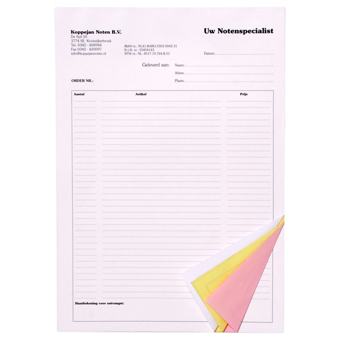 Ga je voor handzaam en compact of kies je liever een doorschrijfset in A4-formaat? Bij ons kies je zelf de maat die bij jouw bedrijf past (A4, A5 of A6), de bedrukking, het materiaalsoort en de juiste afwerking. Laat bijvoorbeeld je bonnenboekjes verlijmen of ga voor losse doordruksets. Uiteraard heb je zelf ook het aantal en de kleur van de doorslagvellen in de hand.