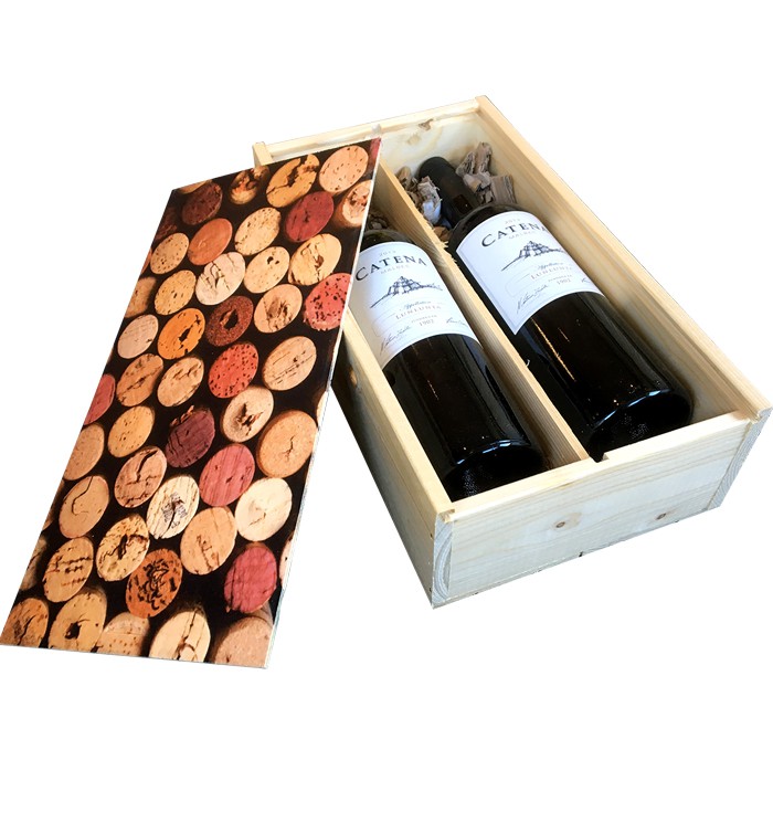 De houten wijnkisten zijn voorzien van een geprinte deksel op 3 mm forex. Wat je wens ook is, ieder ontwerp is mogelijk op de deksel. De houten wijnkisten zijn verkrijgbaar voor één en voor twee flessen.