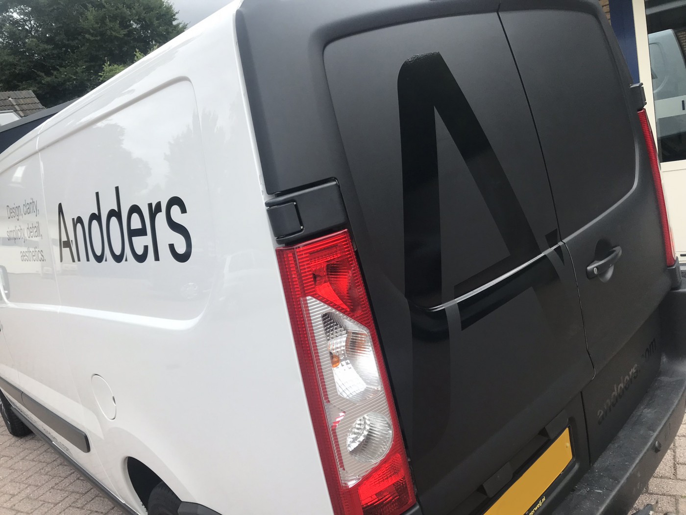 Voor de achterzijde van de bedrijfswagen hebben we gekozen voor een matzwarte folie met een glanzend detail voor een mooi contrast. Dit zorgt voor een chique uitstraling. De zijkanten van de bedrijfswagen hebben we eenvoudig gehouden, zodat het de belettering perfect past bij de huisstijl van Andders Beton en de naam en de kenmerken direct in het oog springen als de bedrijfswagen op weg is.