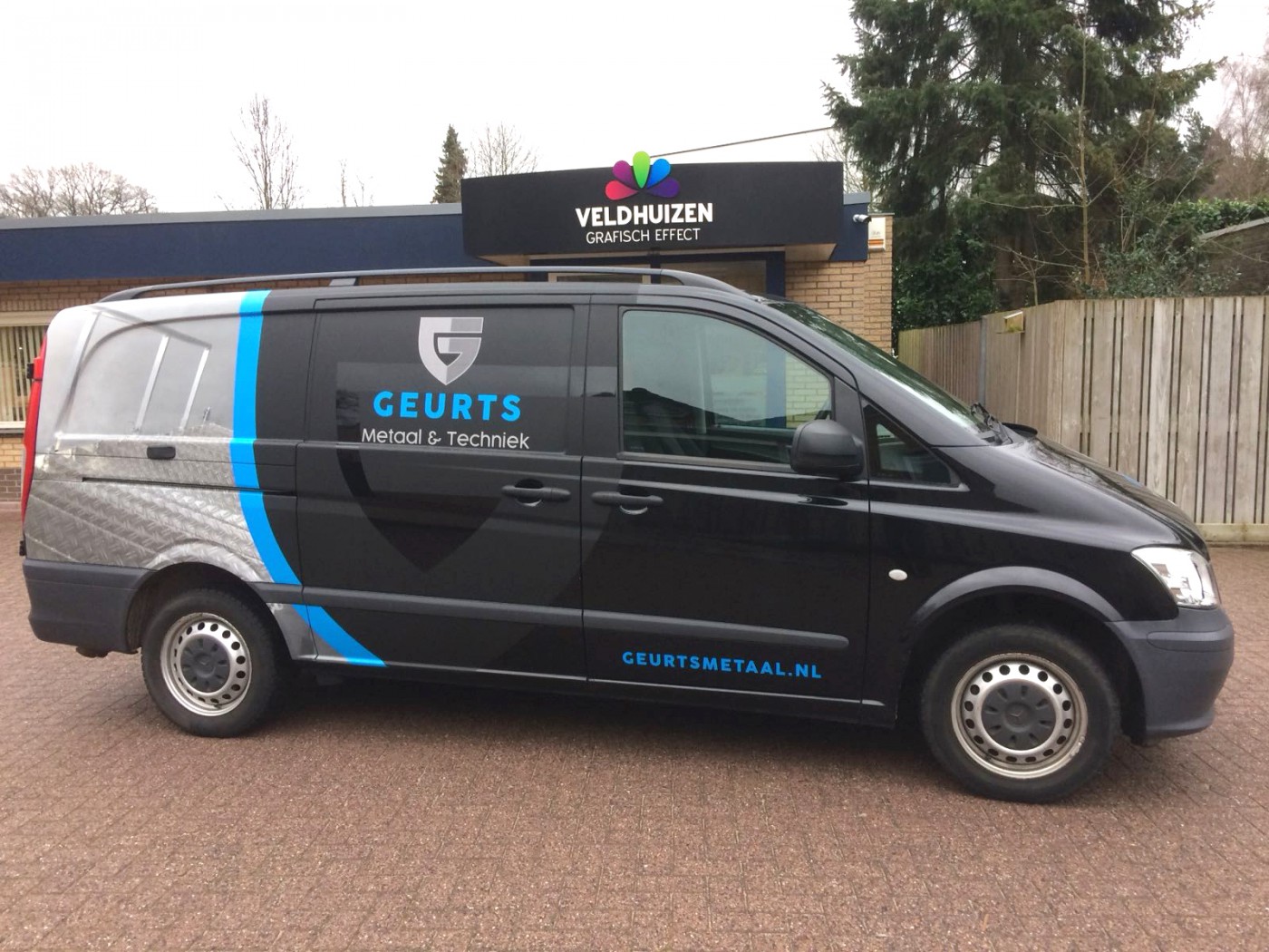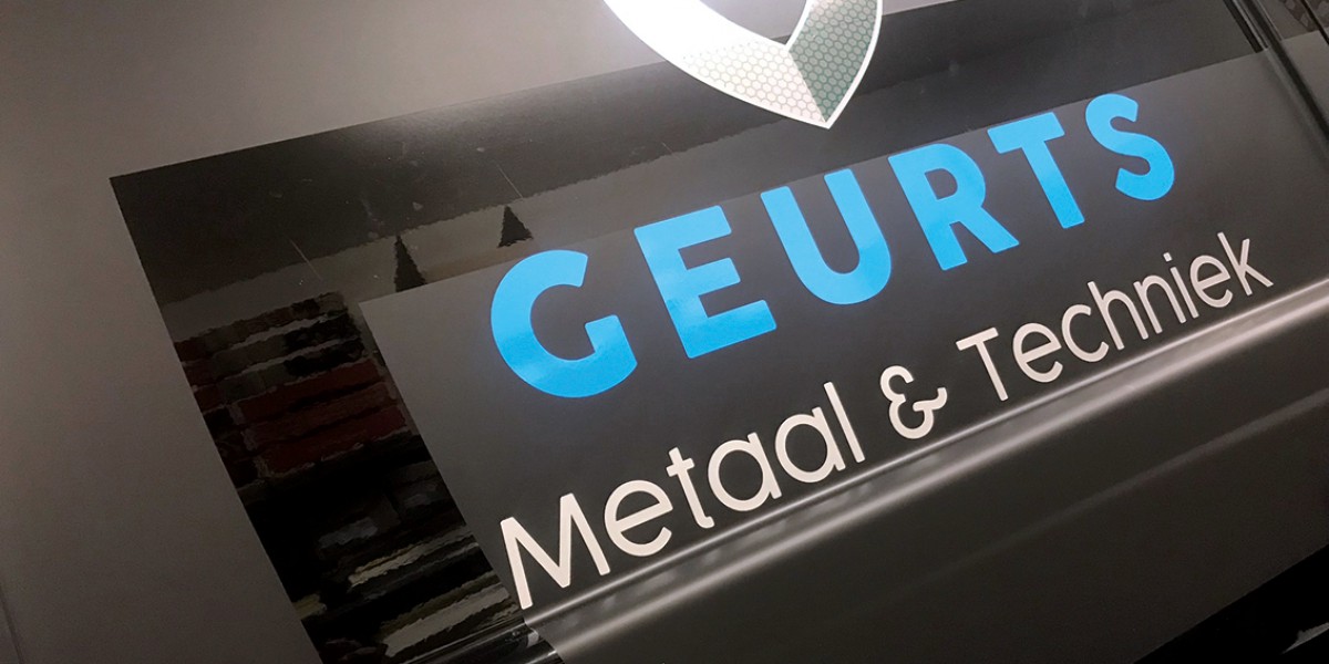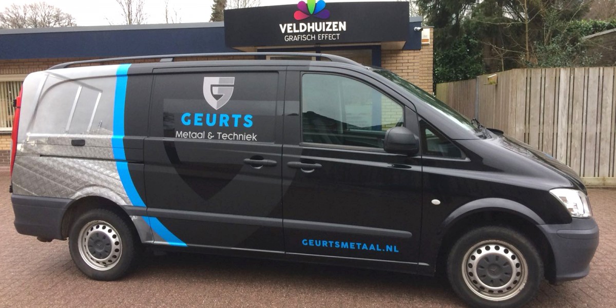 Geurts Metaal & Techniek is gespecialiseerd in de verwerking van rvs en aluminium. De robuuste uitstraling van deze materialen hebben we vertaald in het ontwerp van de belettering van de bedrijfswagen. De zijkanten hebben we voorzien van fullcolour prints, waarin je het metaal terugziet, zodat in één oogopslag duidelijk is waarvoor het bedrijf staat. Het logo is uitgevoerd in een matzwarte folie.