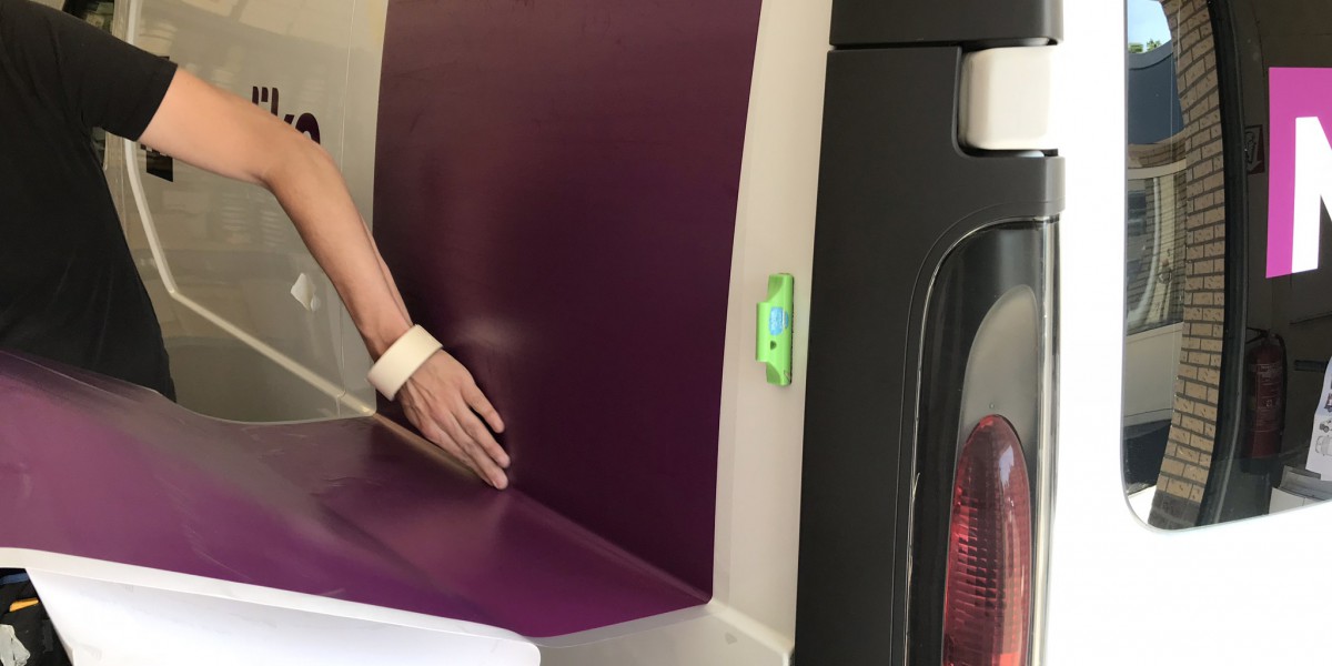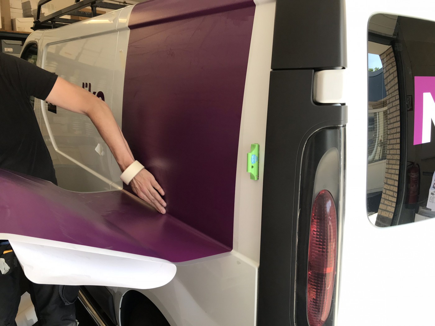 Het logo is samengesteld uit de kleur paars, zwart en wit. Deze kleuren zijn verder doorgevoerd in de opvallende belettering van de bedrijfswagen. In een paarse balk komen de vier diensten in het wit naar voren.