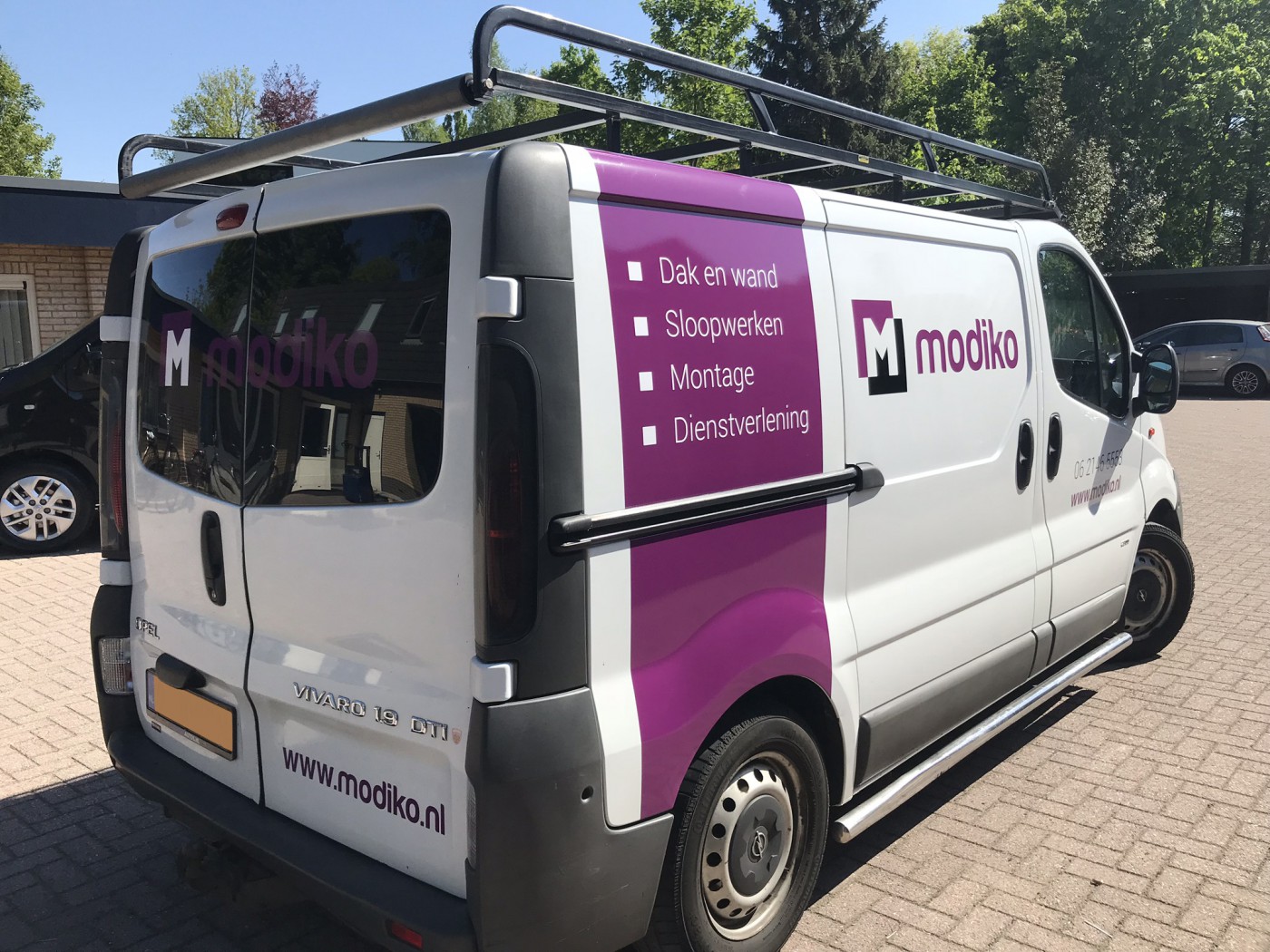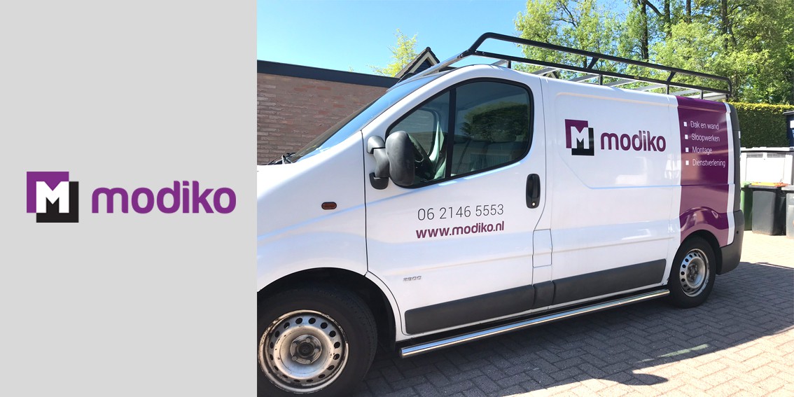 Modiko biedt de volgende diensten aan voor de bouw: dak en wand, sloopwerken, montage en dienstverlening. Voor dit bedrijf uit Uddel hebben we het logo ontworpen, evenals de belettering van de bedrijfswagen.