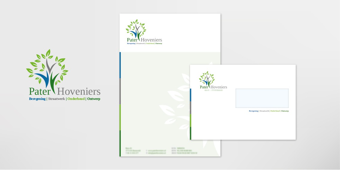 De vier diensten van Pater Hoveniers zijn beregening, aanleg, onderhoud en ontwerp. Deze pijlers komen terug met ieder een eigen kenmerkende kleur in de huisstijl. De boom staat centraal in het logo van Pater Hoveniers. Hier komen de vier kleuren van de pijlers samen tot één karakteristiek, opvallend element. De huisstijl hebben we doorgevoerd in het drukwerk, waaronder het briefpapier, de enveloppen en de visitekaartjes.
