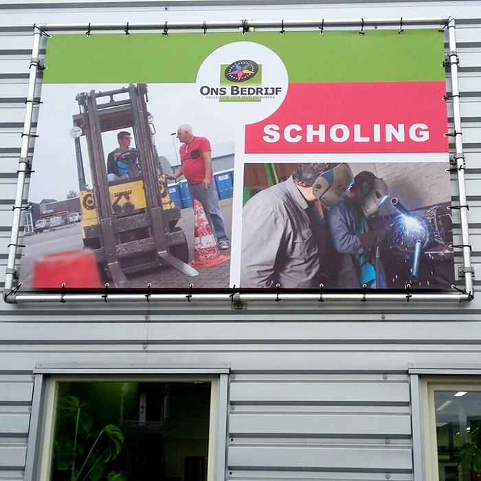 Wij maken ook spandoeken zonder ijzeren frame, die al voorzien zijn van gaten/ringen. Zo bevestig je het spandoek eenvoudig op de gewenste locatie. Je kunt kiezen voor naadloze spandoeken met of zonder tunnel.